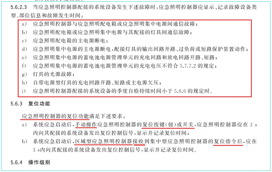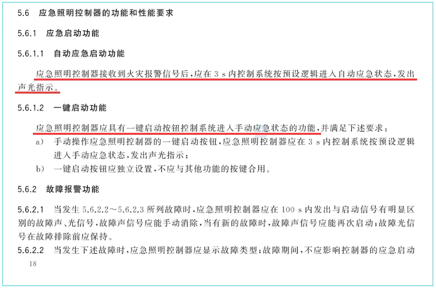 17.应急照明控制器的功能要求:自动应急启动、一键启动功能、故障报警功能、复位功能等。