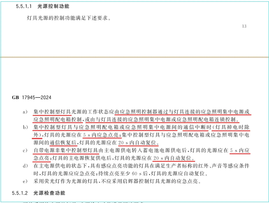 9.灯具光源的控制功能:(1)集中控制型灯具:由应急照明控制器控制通过应急照明集中电源或应急照明配电箱控制,或应急照照明集中电源或应急照明配电箱连锁控制;(2)自带电源非集中控制型灯具:主电源断电5s内自动点亮,主电源恢复,20s内自动复位。