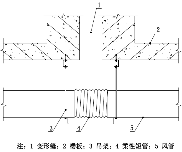 ①②:风管穿越变形缝一端(左)设置活动吊架,另外一端(右)设置风管固定吊架。