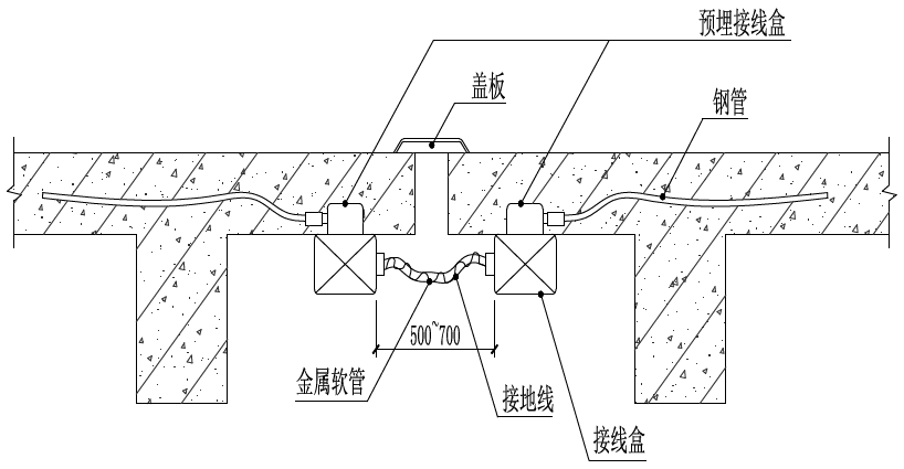 电线管穿越变形缝采用金属软管连接两线盒,并作跨接处理。