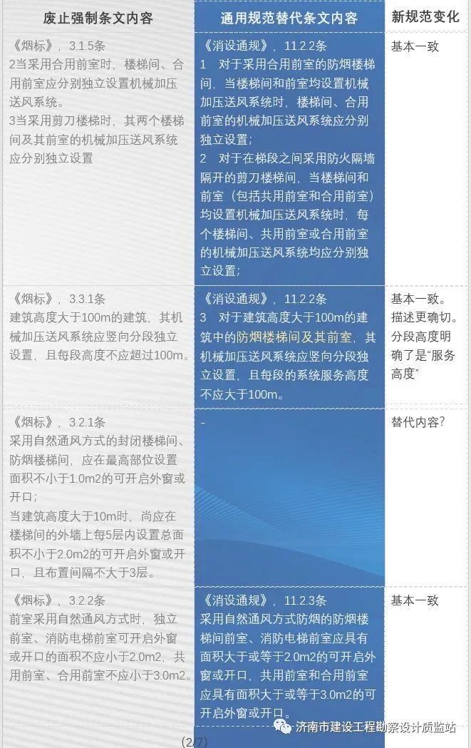此外,《消设通规》中废止了《烟标》第3.2.1条,(原文内容:采用自然通风方式的封闭楼梯间、防烟楼梯间,应在最高部位设置面积不小于1.0m2的可开启外窗或开口;当建筑高度大于10m时,尚应在楼梯间的外墙上每5层内设置总面积不小于2.0m2的可开启外窗或开口,且布置间隔不大于3层。),这条废止后,楼梯间自然通风面积的量化要求在现行国家规范或标准中暂时找不到相应的依据,结合本文结论第10条的理解,笔者认为新规范的本意是废止《烟标》第3.2.1条的分号前的半句,对于原条文分号后的半句,即楼梯间可开启通风面积要求需要在调整后新标准中明确。在此期间,可参照《山东省建设工程消防设计审查验收技术指南》(暖通空调)4.2.1条执行。