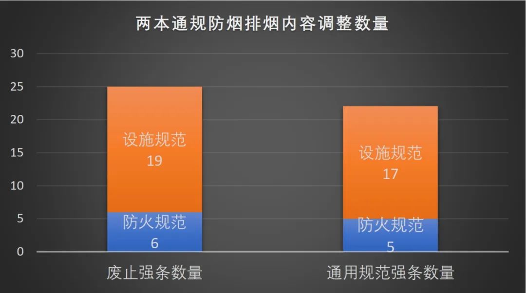 《消防设施通用规范》和《建筑防火通用规范》已于今年3月1日和6月1日先后实施,现对比两本通用规范与废止的若干本现行规范里的强制性条文内容,以供大家直接地了解新规范中消防防排烟要求的变化,跟消防防烟排烟内容有关的废止强制性条文数量以及新通用规范强制性条文数量对比如下图所示: