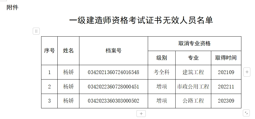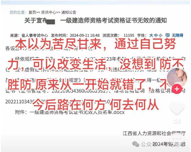 2024年9月,江西省人社厅发布一则官方通知,宣布考生杨娇因提供虚假证明材料,所取得的一级建造师资格证书(建筑专业)以及市政、公路增项证书全部作废!