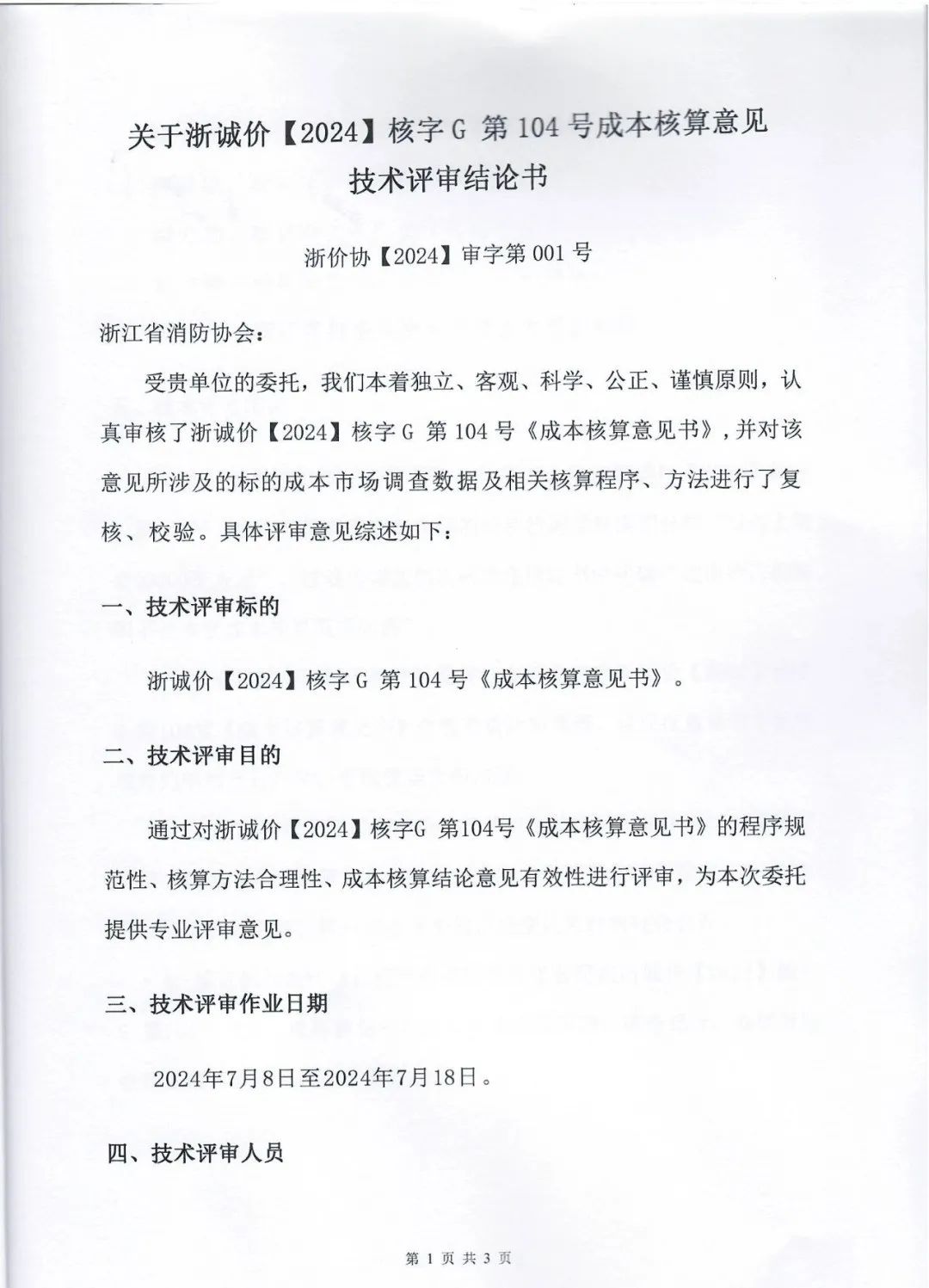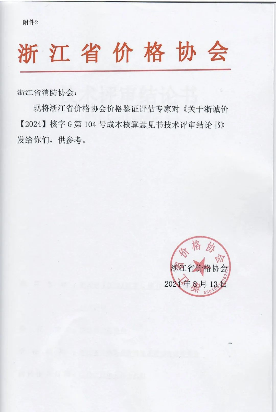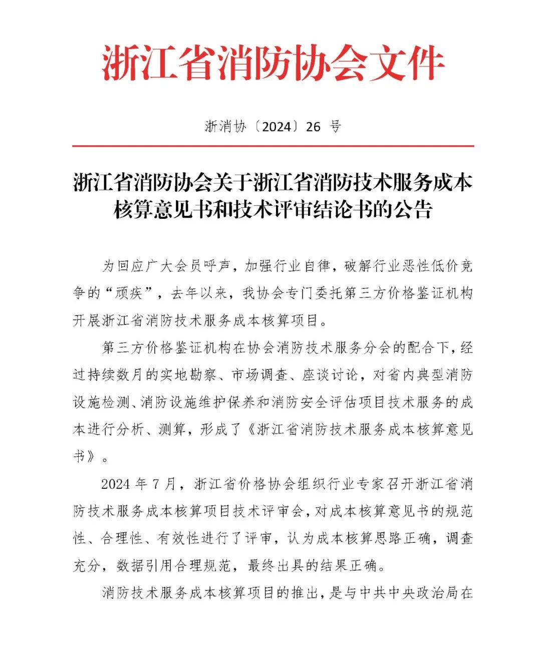 2024 年 7 月,浙江省价格协会组织行业专家召开浙江省消防技术服务成本核算项目技术评审会,对成本核算意见书的规范性、合理性、有效性进行了评审,认为成本核算思路正确,调查充分,数据引用合理规范,最终出具的结果正确。