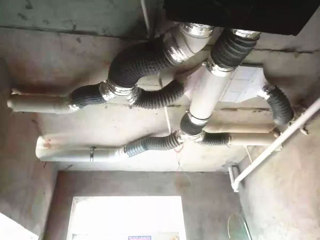 【这是目前“最有创意”的新风系统安装方式之一了,又是软管,又是变径,又是过梁器。真想弱弱地问安装师傅一句:这么装,风口还有风没有?】 ![]()