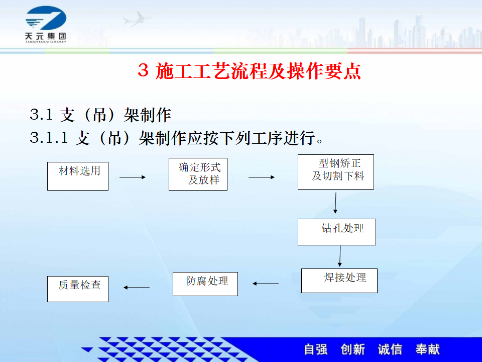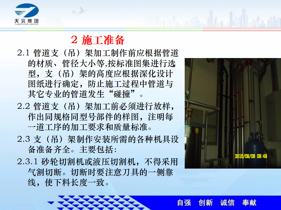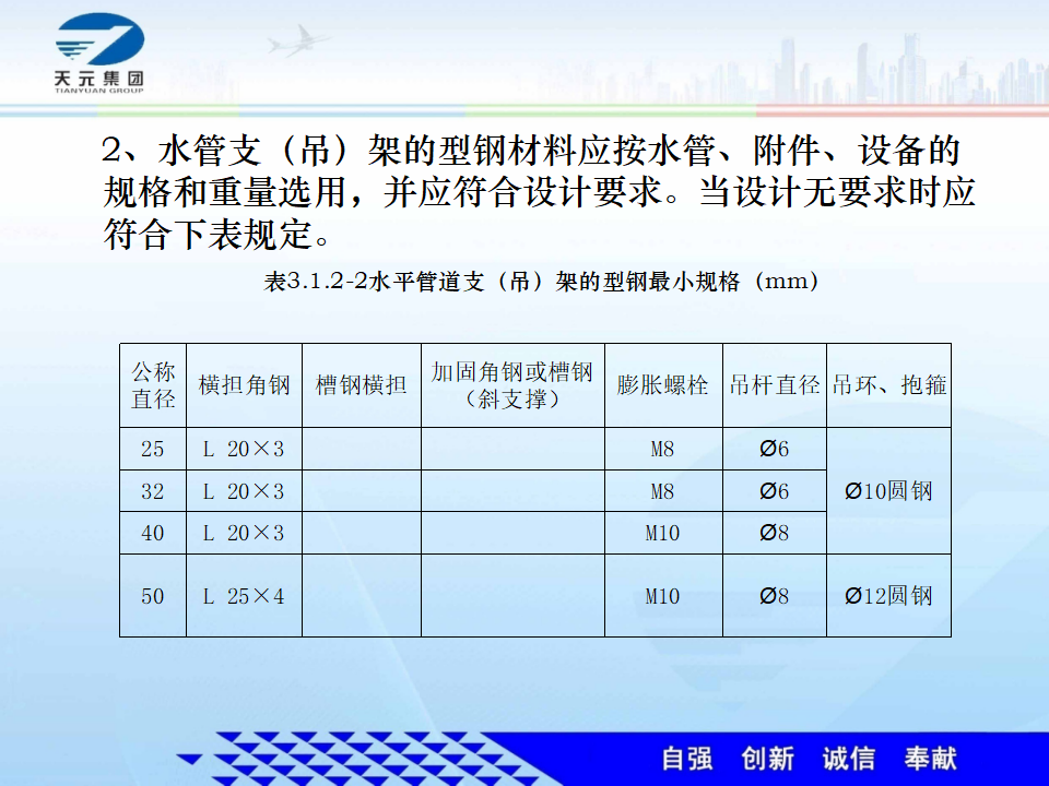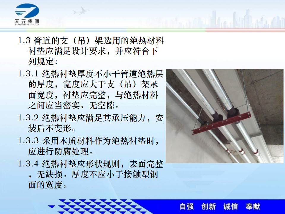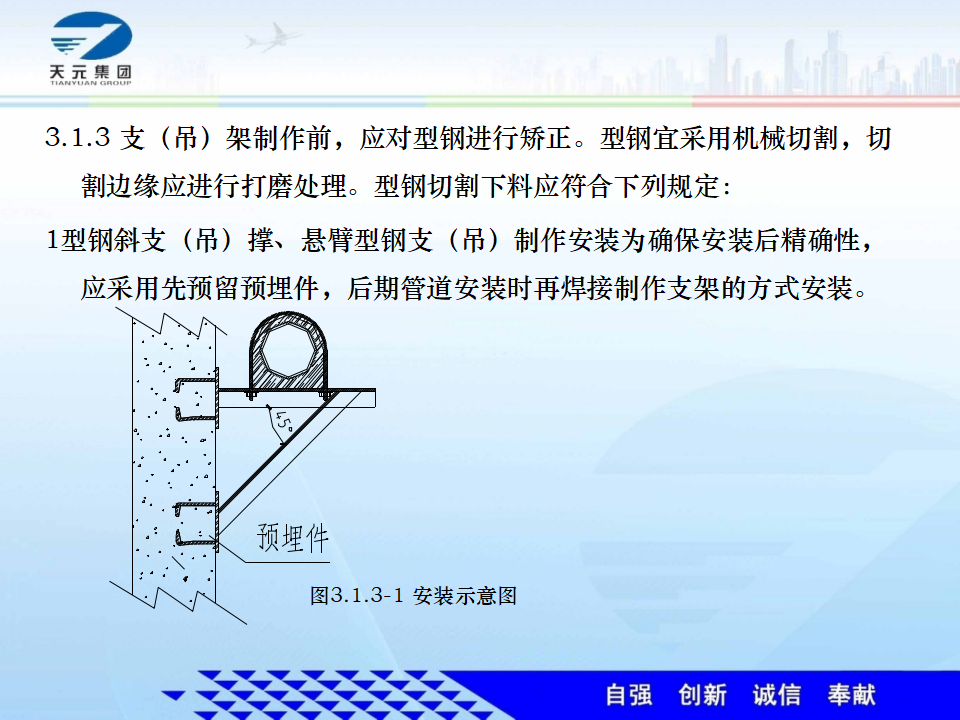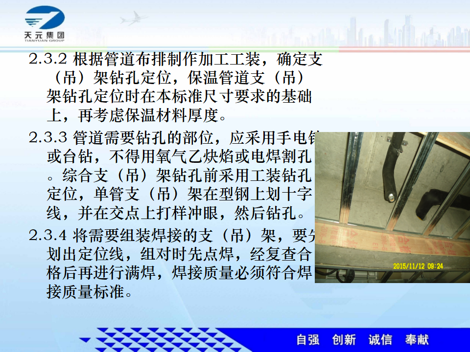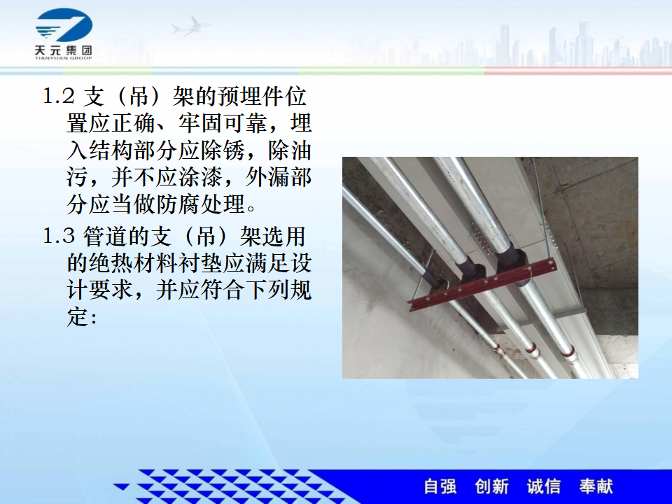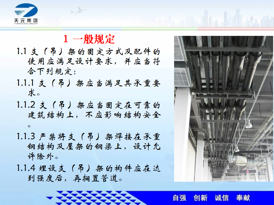 1.1 支(吊)架的固定方式及配件的使用应满足设计要求,并应当符合下列规定: 1.1.1 支(吊)架应当满足其承重要求。 1.1.2 支(吊)架应当固定在可靠的建筑结构上,不应影响结构安全。 1.1.3 严禁将支(吊)架焊接在承重钢结构及屋架的钢梁上,设计允许除外。 1.1.4 埋设支(吊)架的构件应在达到强度后,再搁置管道。