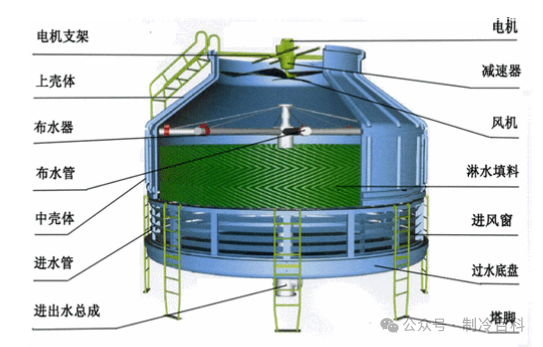 风机:风机是冷却塔的核心部件之一,通常位于塔体的顶部或侧面。它通过旋转产生气流,将空气引入塔内并与水进行热交换。风机的类型可以是轴流式或离心式,具体选择取决于冷却塔的设计和使用需求。