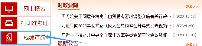登录中国人事考试网(http://www.cpta.com.cn/),点击左侧导航栏【成绩查询】。