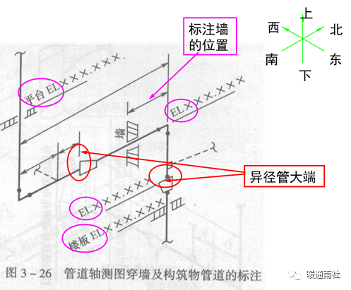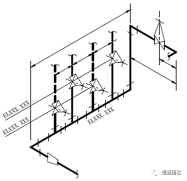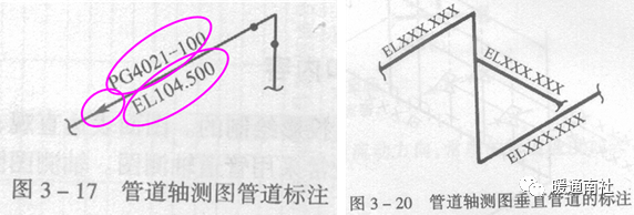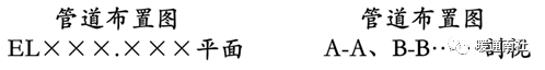 水平管道注长度尺寸和管中心标高,垂直管道注标高EL。