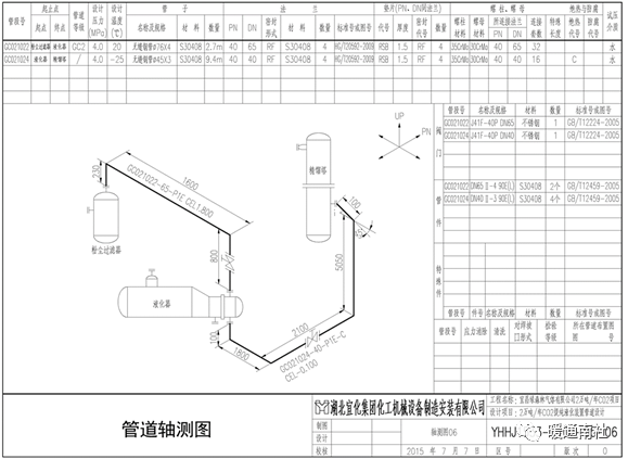 4、材料表:列出这段管道安装所需要的材料,即管子、管件和阀门等规格、型号、尺寸、数量和标准等。材料表附在图纸的右侧。