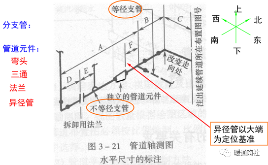 标注示例:从最邻近的主要基准点到分支管、管道改变走向处、拆卸用的法兰、异径管。不注封闭尺寸。