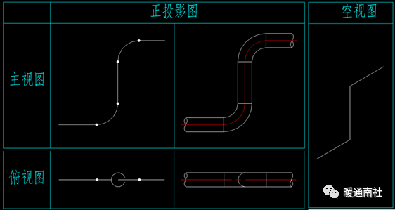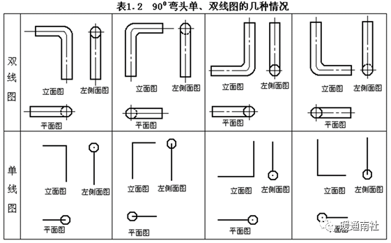 2、90°弯头的单双线三视图