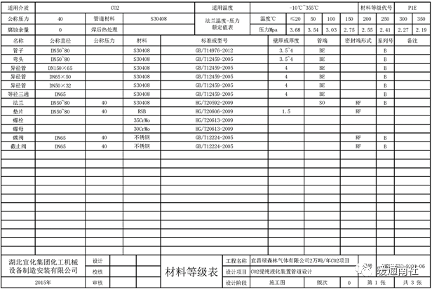 管道材料等级表内容包括:工程名称;管道材料等级代号;适用的介质范围;适用温度范围;管道公称压力;法兰温度——压力范围表;管道分支表号;管道规格参数;阀门规格参数;法兰规格参数;垫片规格参数;紧固件规格参数;管件规格参数。