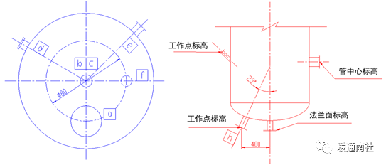 b) 标注水平管口中心线的标高、垂直管口法兰面的标高。