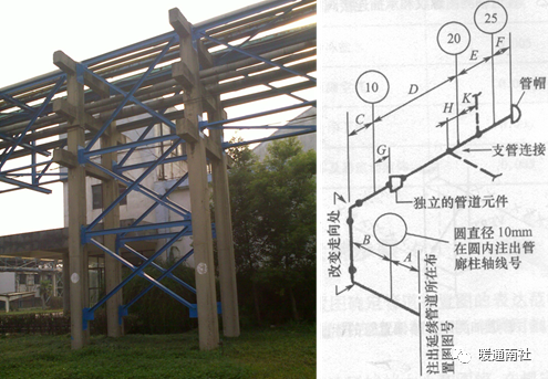 b)以管廊支柱为基准标注管道及管道元件的定位尺寸。