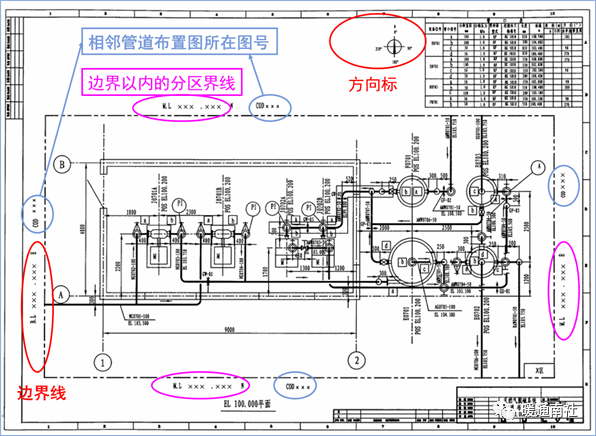 方法:按设备布置图分区进行投影,分区范围内所有的管道投影在一张图纸上表示,包括平面图和剖面图。