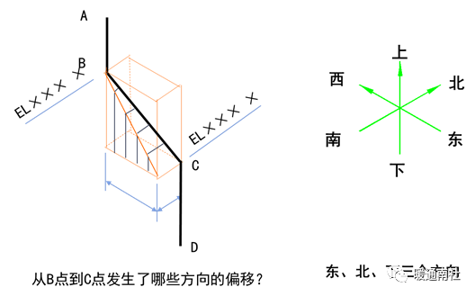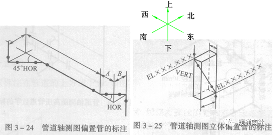 空间偏置的标注:画出三个坐标轴组成的六面体,标注出起始和终点的标高及两个方向的偏移尺寸,或者注出管段两端的坐标。