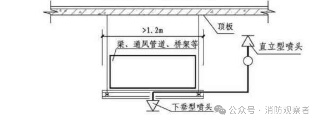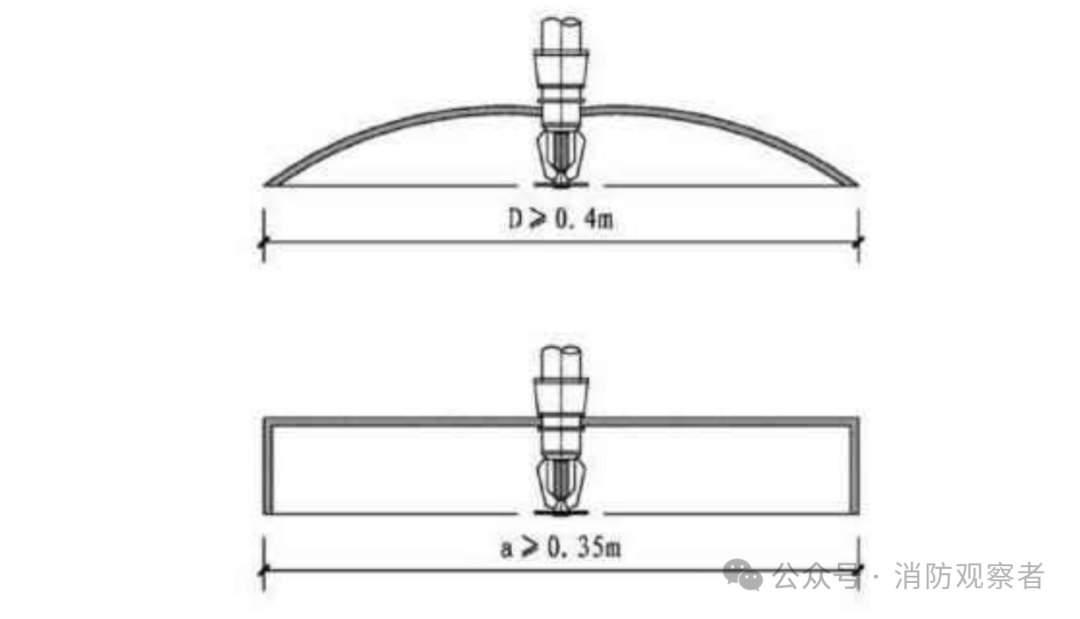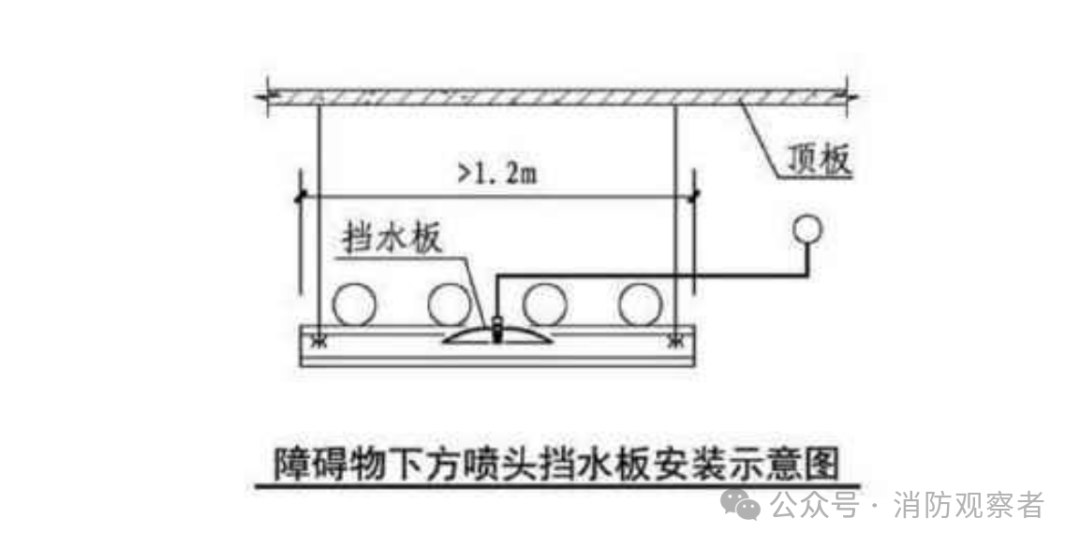 对于货架内置喷头和障碍物下方设置的喷头,如果恰好在喷头的上方有孔洞、缝隙,为防止上部的喷头动作后淋湿下方的喷头而影响喷头动作,规定可在其上方设置挡水板。