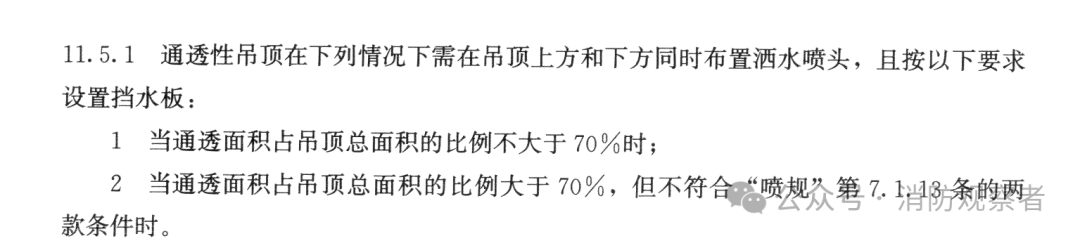 一、当通透性吊顶面积占吊顶总面积的比例不大于 70%,应在吊顶上、下分别设置喷头,且应在下垂型喷头的上方设置挡水板。