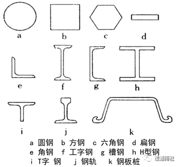 在机电工程中,常用的型材主要有:圆钢、方钢、扁钢、H型钢、角钢、工字钢、T型钢、槽钢、钢轨等。