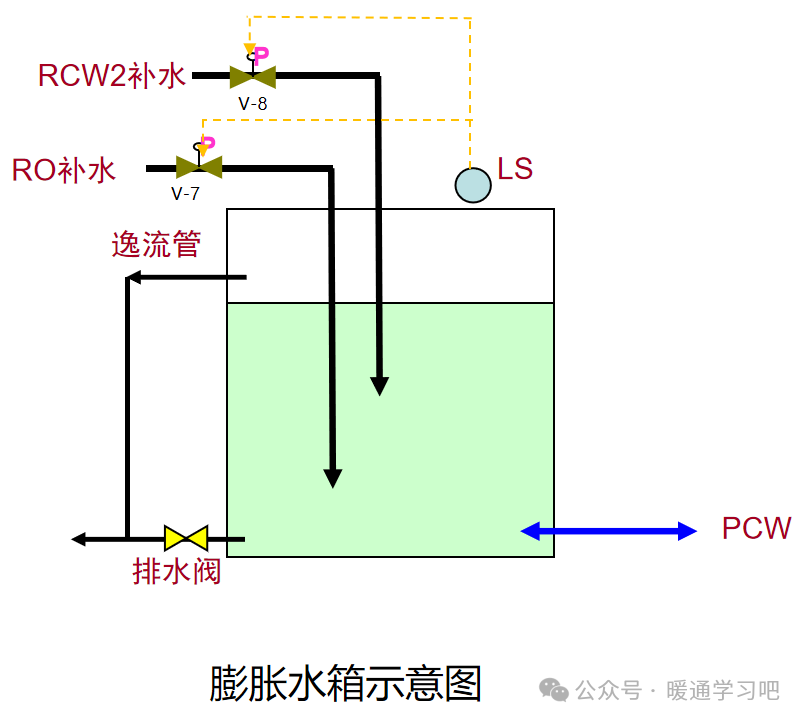 (2)补水、排水系统的设计:PCW因工艺要求水质补水常用的为一级RO水或二级RO水。RO水从纯水站的RO水箱经RO水输送泵输送到PCW膨胀补水箱。膨胀水箱设计有RO水补水电动阀,以及应急自来水补水阀,和液位计。