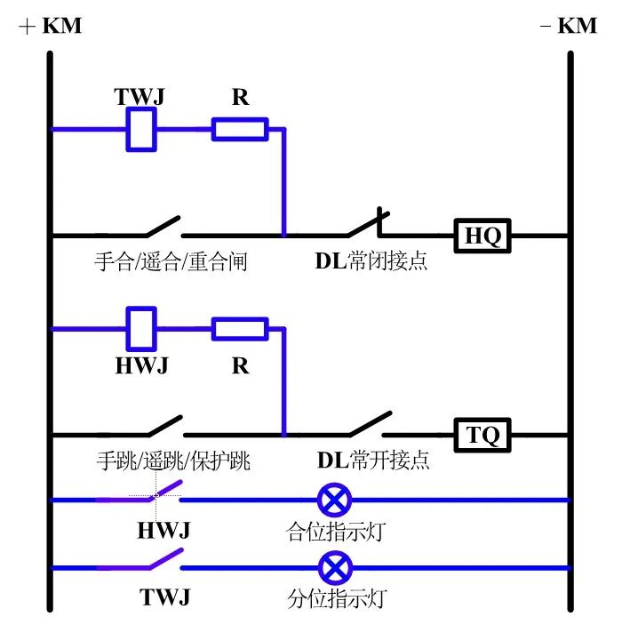 控制回路应该能够反映断路器的位置状态以及跳合闸回路的完整性。所以我们在回路中增加了TWJ、HWJ来监视跳闸回路、合闸回路的完整性,如图2中用蓝色部分所示。HWJ和TWJ分别为合、分闸监视继电器。