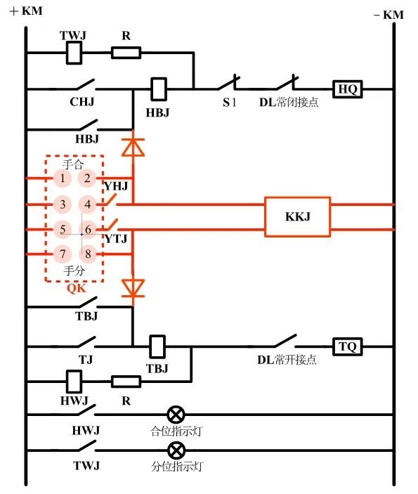一般断路器分、合闸操作可分为:就地手动、远方遥控以及保护装置自动控制三种方式,控制回路应该具有区分保护装置动作和人为操作断路器的功能,所以还应加入合后继电器(KKJ),如图4中红色部分。