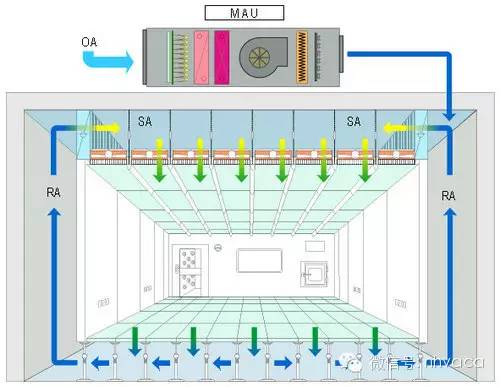 组合式空调箱:主要是抽取室内空气(return air) 和部份新风以控制出风温度和风量来并维持室内温度。