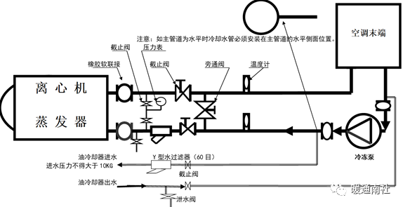 7.油冷却器的进出水必须接在冷冻水泵的进出水管上,接在主水管的侧面。