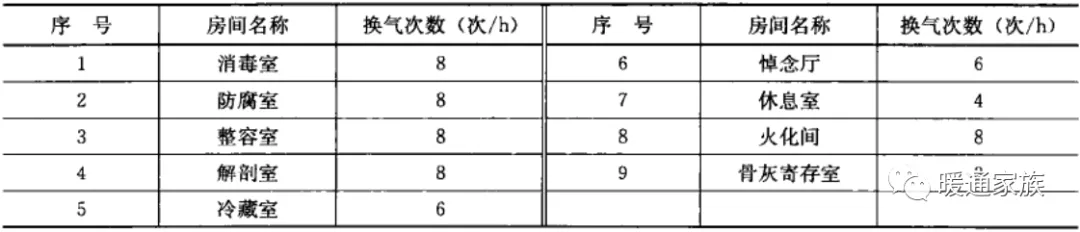 殡仪馆各类用房换气次数不低于下表的规定。