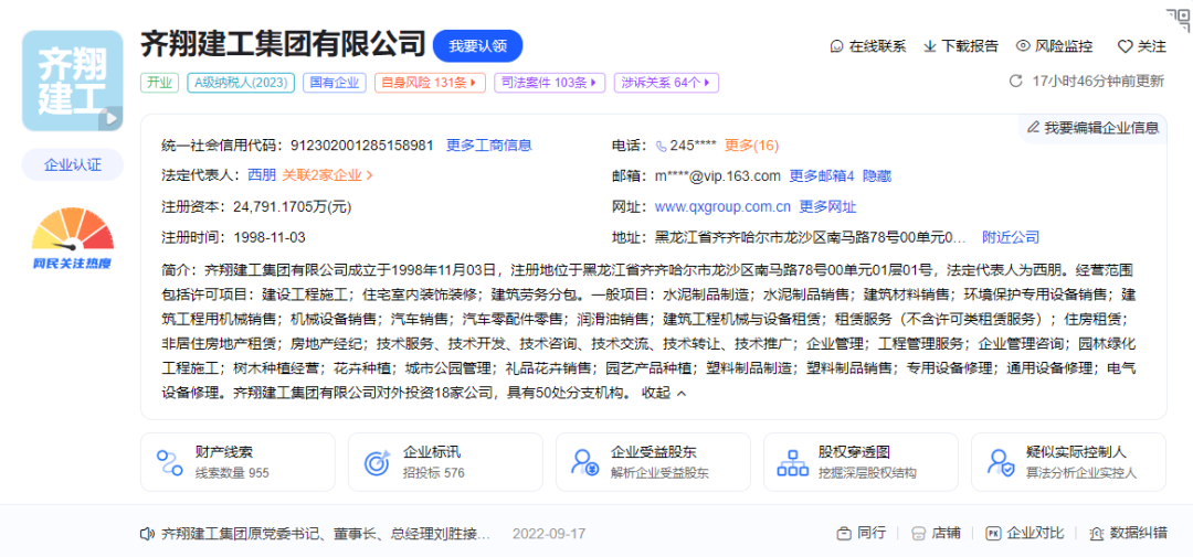 齐翔建工集团有限公司成立于1998年11月03日,注册地位于黑龙江省齐齐哈尔市龙沙区南马路78号00单元01层01号,法定代表人为西朋。经营范围包括许可项目:建设工程施工;住宅室内装饰装修;建筑劳务分包。一般项目:水泥制品制造;水泥制品销售;建筑材料销售;环境保护专用设备销售;建筑工程用机械销售;机械设备销售;汽车销售;汽车零配件零售;润滑油销售;建筑工程机械与设备租赁;租赁服务(不含许可类租赁服务);住房租赁;非居住房地产租赁;房地产经纪;技术服务、技术开发、技术咨询、技术交流、技术转让、技术推广;企业管理;工程管理服务;企业管理咨询;园林绿化工程施工;树木种植经营;花卉种植;城市公园管理;礼品花卉销售;园艺产品种植;塑料制品制造;塑料制品销售;专用设备修理;通用设备修理;电气设备修理。齐翔建工集团有限公司对外投资18家公司,具有50处分支机构。