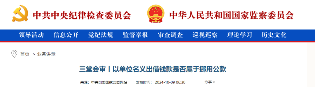 10月9日,中共中央纪委监委发布《三堂会审丨以单位名义出借钱款是否属于挪用公款》。