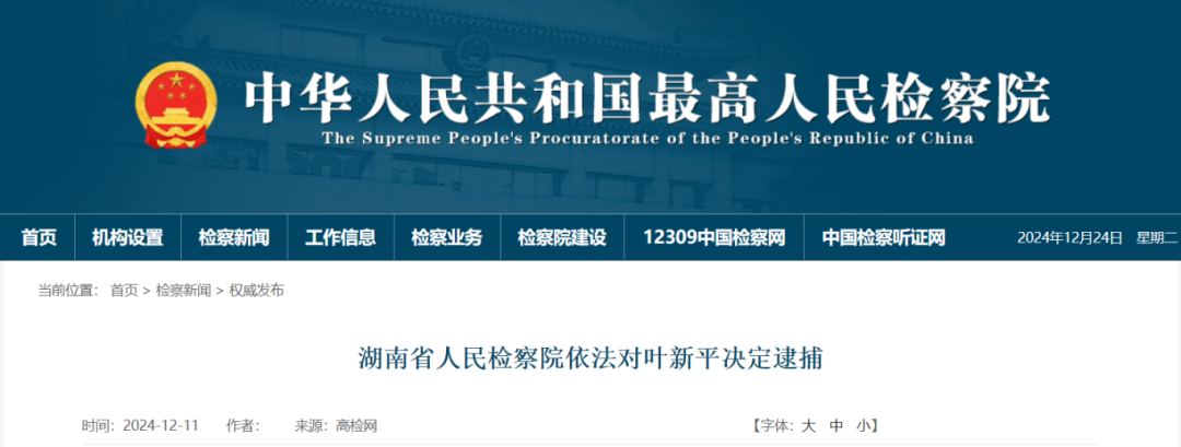 12月11日从最高人民检察院获悉,原湖南建工集团有限公司党委书记、董事长叶新平(正厅级)涉嫌受贿一案,由湖南省监察委员会调查终结,移送检察机关审查起诉。日前,湖南省人民检察院依法以涉嫌受贿罪对叶新平作出逮捕决定。该案正在进一步办理中。