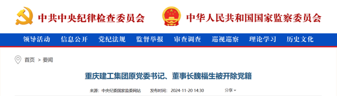 日前,经市委批准,市纪委监委对重庆建工集团原党委书记、董事长魏福生严重违纪违法问题进行了立案审查调查。