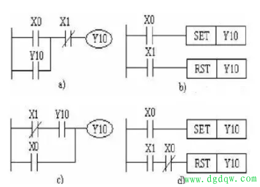 在PLC(可编程逻辑控制器)编程领域,结构化文本和梯形图是两种最为广泛使用的编程语言。对于初学者或缺乏相关背景的技术人员来说,从梯形图入手学习PLC编程无疑是一条捷径。这是因为,无论PLC的品牌如何,其梯形图的结构都与实际电气控制回路有着惊人的相似性。接下来,我们将介绍几种常见的控制电路,帮助大家回顾并深化对这一领域的理解。 1.启动、保持与停止电路 启动、保持与停止是PLC编程中的基础功能。通过四种不同的梯形图实现方式(如图a、b、c、d所示),我们可以清晰地看到如何实现这一功能。在这些梯形图中,x0代表启动信号,X1代表停止信号。图a和图c利用Y10的常开触点实现自锁保持,而图b和图d则通过SET和RST指令实现同样的效果。