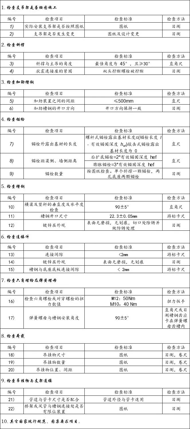 7、抗震支吊架与结构的连接,吊杆与槽钢的连接,螺栓螺母与连接件的扭矩应符合设计文件的规定,安装应牢固。