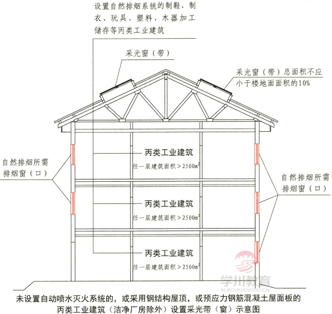 1.未设置自动喷水灭火系统的,或采用钢结构屋顶,或采用预应力钢筋混凝土屋面板的建筑,不应小于楼地面面积的10%。