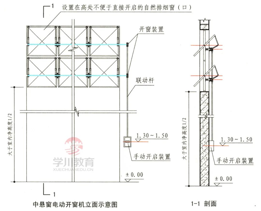 五、自然排烟窗(口)应设置手动开启装置,设置在高位不便于直接开启的自然排烟窗(口),应设置距地面高度1.3m~1.5 m的手动开启装置。