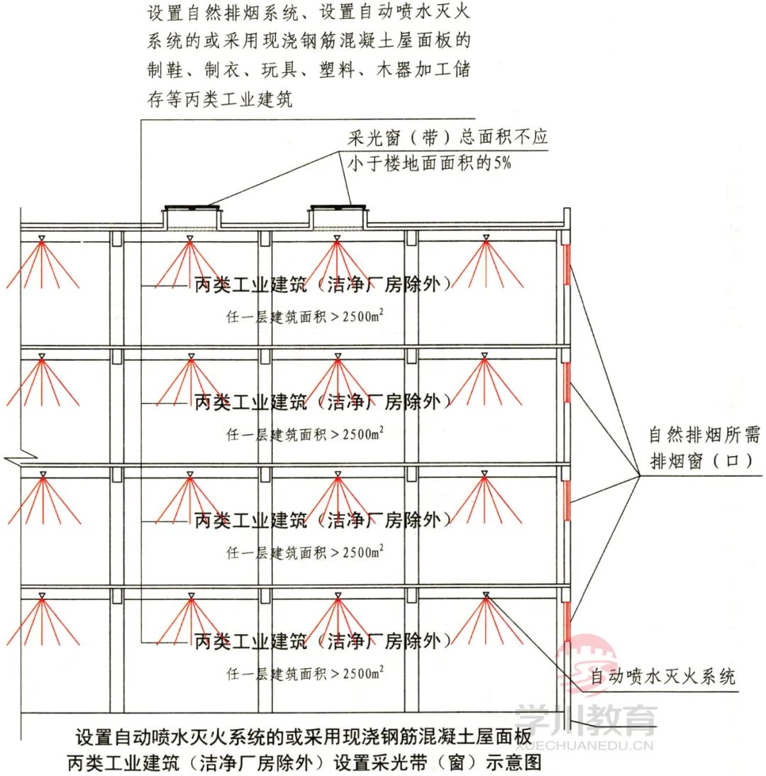 六、除洁净厂房外,设置自然排烟系统的任一层建筑面积大于2500㎡的制鞋、制衣、玩具、塑料、木器加工储存等丙类工业建筑,除自然排烟所需排烟窗(口)外,尚宜在屋面上增设可熔性采光带(窗),其面积应符合下列规定: