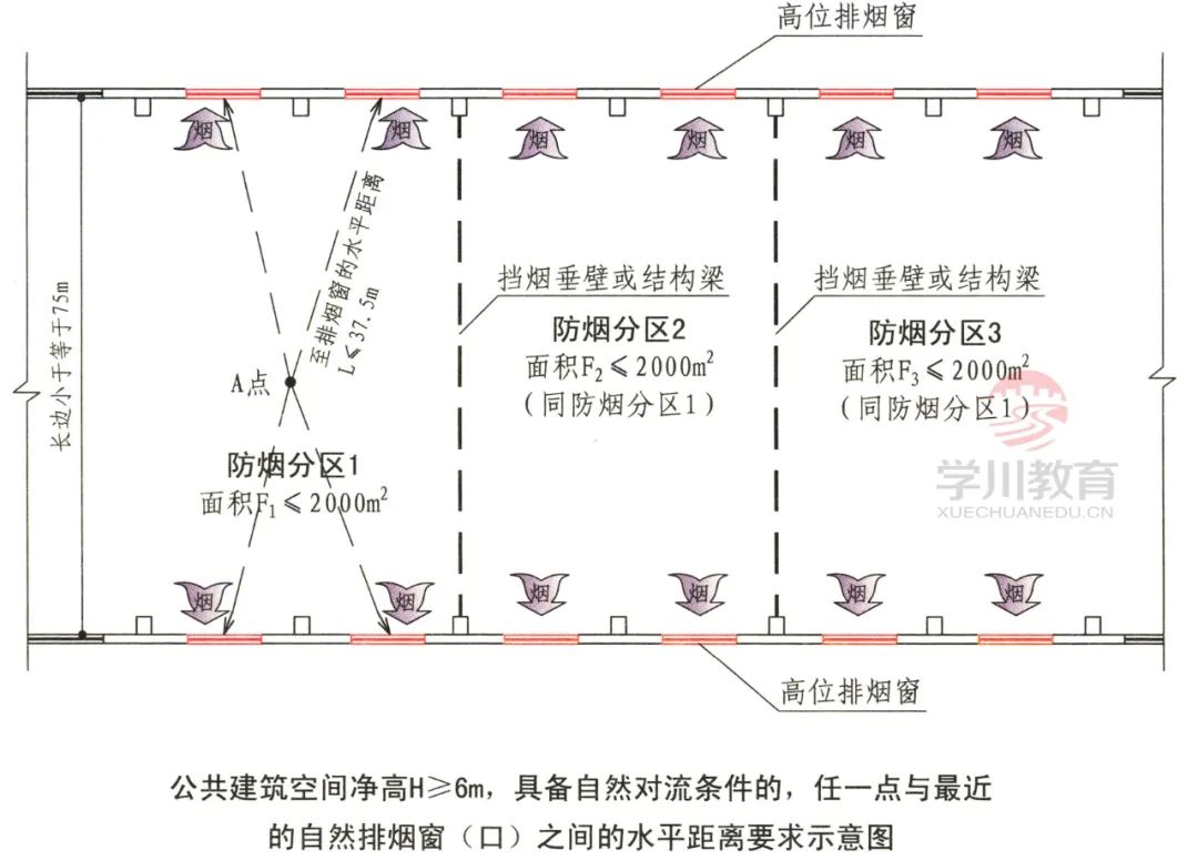 二、防烟分区内自然排烟窗(口)的面积、数量、位置应按相关规定经计算确定,且防烟分区内任一点与最近的自然排烟窗(口)之间的水平距离不应大于30m。