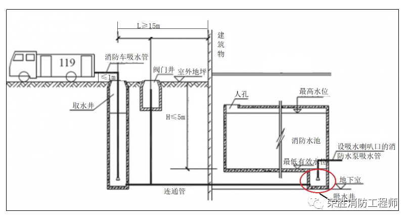 1)吸水高度不应大于6.0m;(考虑消防车吸水管距室外地坪1m,取水口距消防水池最低有效水位≤5m