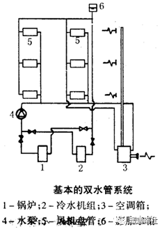 1、双水管系统:冬季供热水和夏季供冷水均在相同的管路中进行。