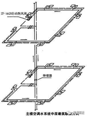 图示的双水管系统,按朝向分区,每区设备水泵并利用三通阀进行水温调节,满足各分区不同负荷的要求。
