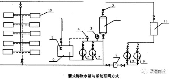 NG型、NGP型囊式膨胀水箱与系统联网方式见下图。