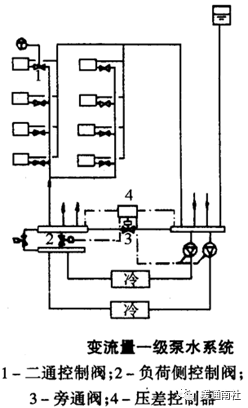 图为一冷源侧定流量、负荷侧变流量的单级泵水系统示意图。