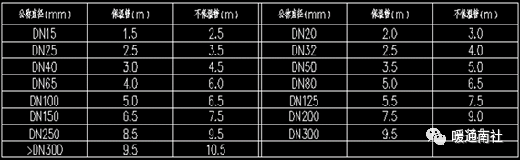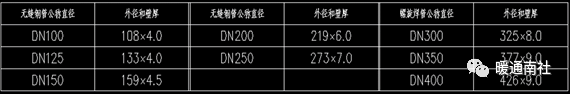 冷水管、冷却水管、冷凝水管、膨胀水管,公称直径≤DN80采用镀锌钢管,DN100≤公称直径<DN300采用无缝钢管,≥DN300采用螺旋焊管。无缝钢管和螺旋焊管外径及壁厚按下表执行。无缝钢管材质应符合GB/T8163-2018规定要求。