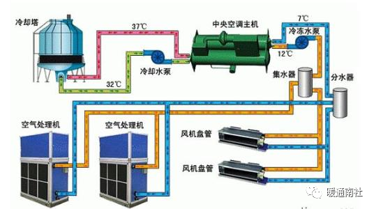 冷冻水循环系统:从制冷机组蒸发器流出的低温冷冻水进入分水器,然后经过分水器分配到室内的末端设备(风机盘管、空气处理机组)再与室内空气进行热交换,带走房间内的热量,达到制冷,最后经冷冻水泵回到主机蒸发器完成一个循环。