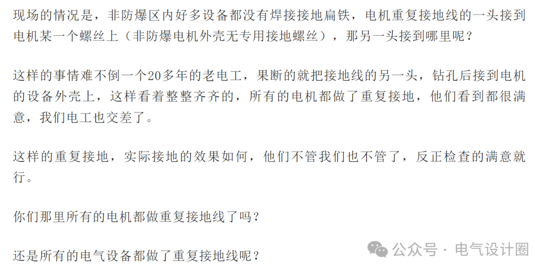 公司防爆区域的电机都有重复接地线,非防爆区电机接地没问题,那现场的配电箱、按钮箱、仪表等你怎么不要求接地呢?难道是只知道电机要重复接地。
