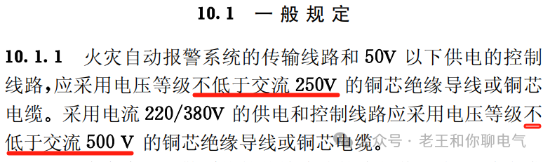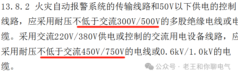 GB50116-98《火灾自动报警系统设计规范》对于火灾自动报警系统的传输线路和50V以下供电的控制线路,应采用电压等级不低于交流250V 的铜芯绝缘导线或铜芯电缆。采用电流220/380V的供电和控制线路应采用电压等级不低于交流 500V的铜芯绝缘导线或铜芯电缆。