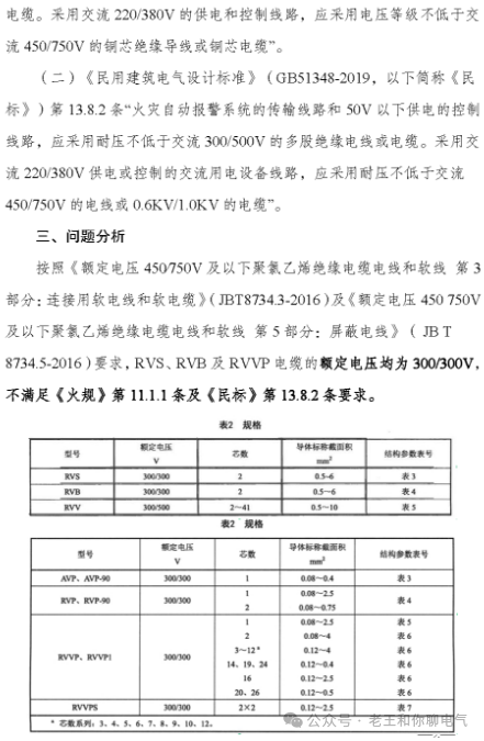 因此,RVS、RVB、RVVP线缆的电压等级不满足GB50116-2013《火灾自动报警系统设计规范》、GB 51309-2018《消防应急照明和疏散指示系统技术标准》、GB 51348-2019《民用建筑电气设计标准》等各大规范的要求,不能使用!